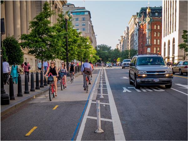 2. Increased sidewalk and protected bike lanes: using lane control signs and flexible barriers.