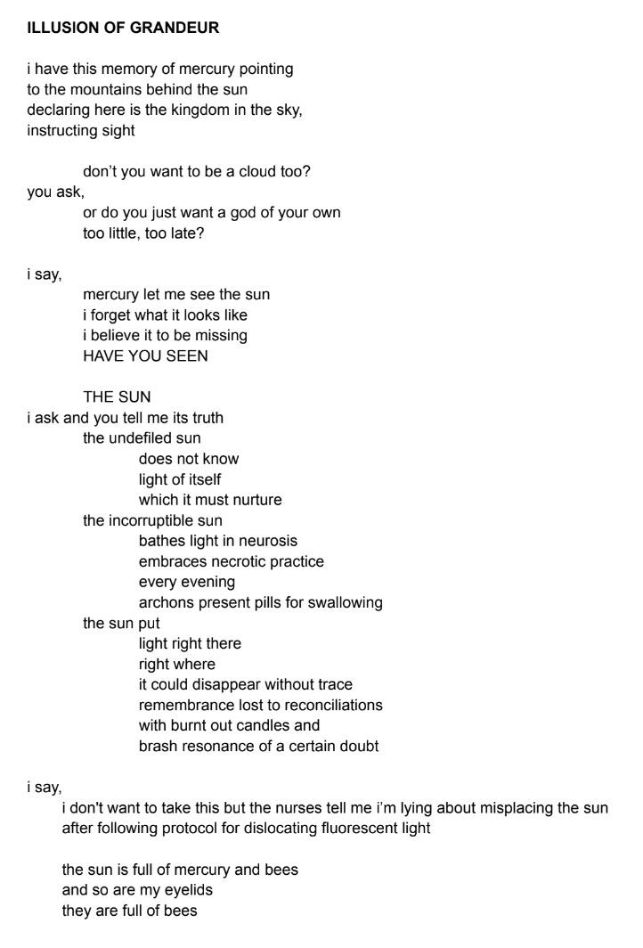 Once claimed, my personhood dissolved into a projection of what I could become. It was an ugly gnarly thing, you couldn’t bear to look away, fascinated by what fell apart. You wanted to dissect me until I was nothing but strayed parts, and yet to claim them would be a rejection of self