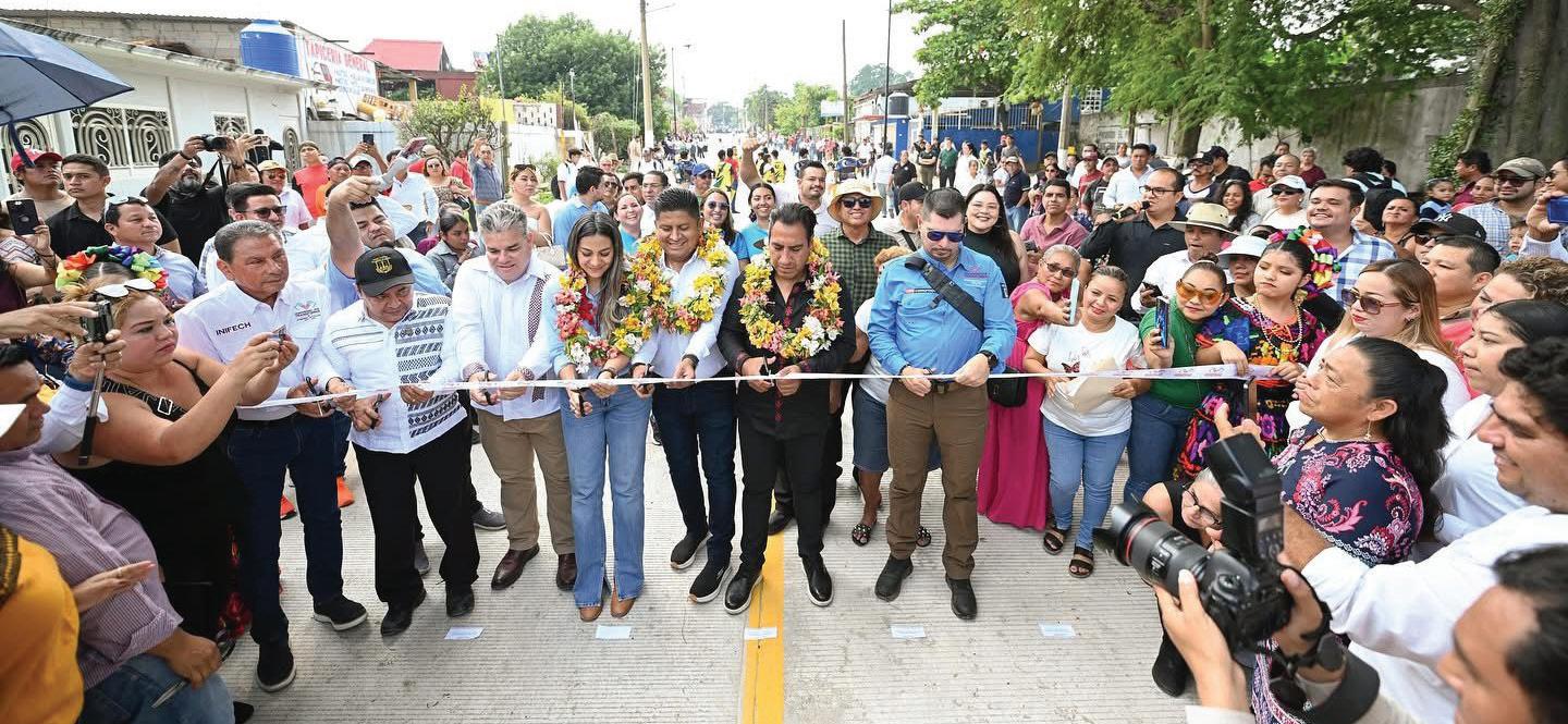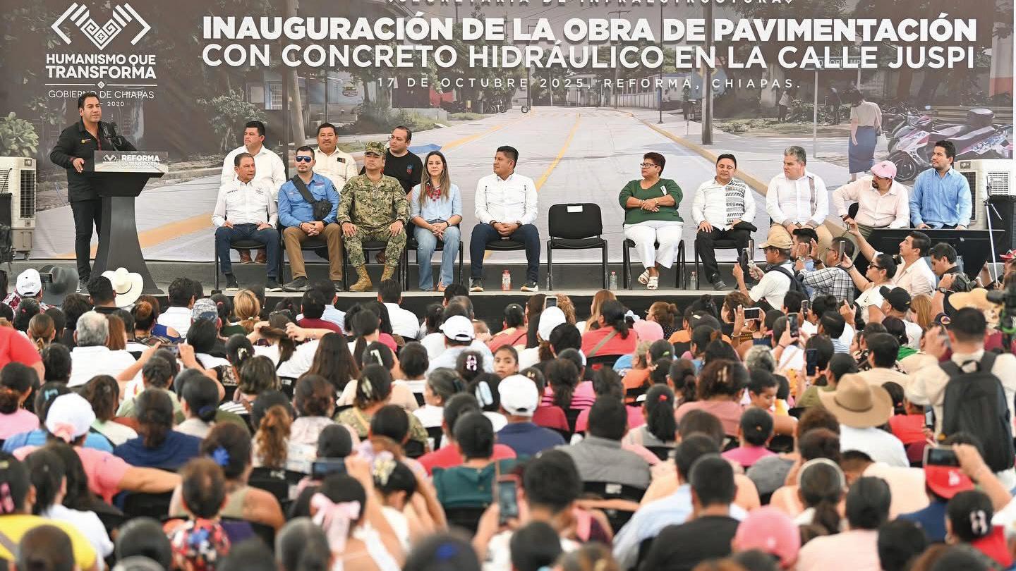 El magistrado presidente del Tribunal Superior de Justicia y del Consejo de la Judicatura, Juan Carlos Moreno Guillén, junto al gobernador Eduardo Ramírez Aguilar, estuvo presente en la Inauguración de la pavimentación con concreto hidráulico de la calle Juspi, en Reforma, Chiapas.