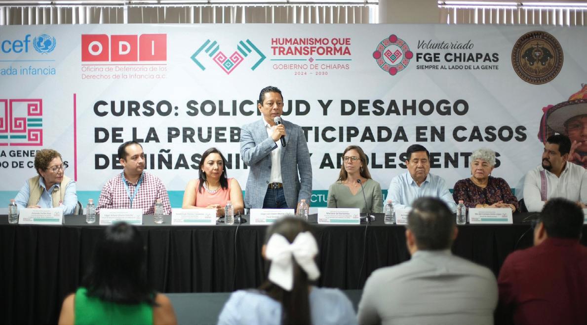 En su intervención, el representante de UNICEF, Edgar Arturo Olvera Canche, reconoció a la Fiscalía de Chiapas por ser la pionera en la realización de este curso y agregó que el UNICEF continuará siendo aliada de estas acciones en coordinación con la Oficina de la Defensoría de los Derechos de la Infancia (ODI).