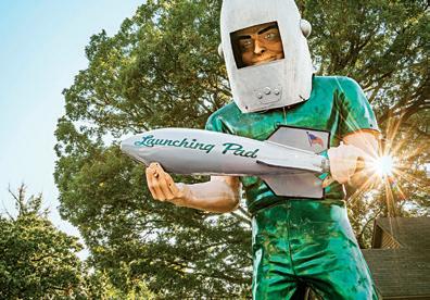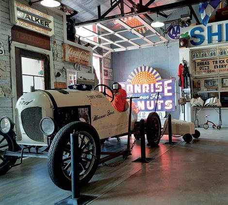 For lunch in Springfield, stop at Cozy Dog Drive In , famous for its cornmealbattered hot dog on a stick and loaded with Route 66 lore. Or eat at Motorheads Bar & Grill with its huge collection of vintage advertising and automotivethemed memorabilia. Motorheads’ towering Route 66 shield sign and the Fairgrounds’ installations were done by Springfield’s family-owned Ace Sign Company , which offers free guided tours of its plant/museum.