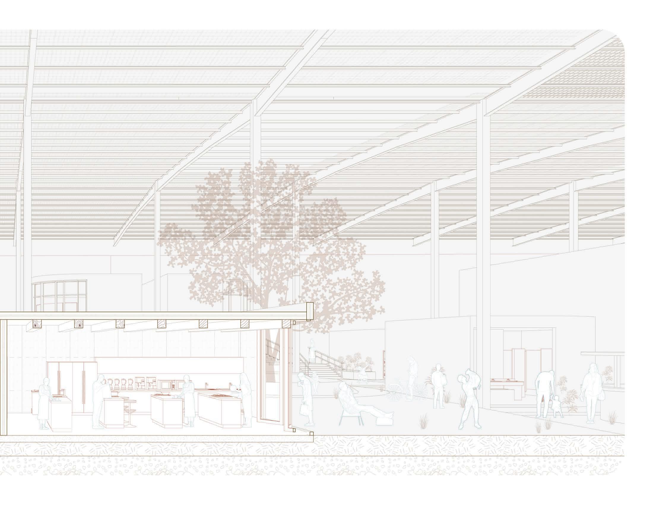 The open kitchen offers nine complete stations for cooking lessons, with a storage and refrigeration area at the side, and an opposing curtain wall with views to the terrace and plaza. This space is larger than the café’s kitchen without sacrificing quality equipment. This service kitchen has a convenient connection to the community garden’s dry storage room for access towards bulked goods, fresh vegetables or other needed items.