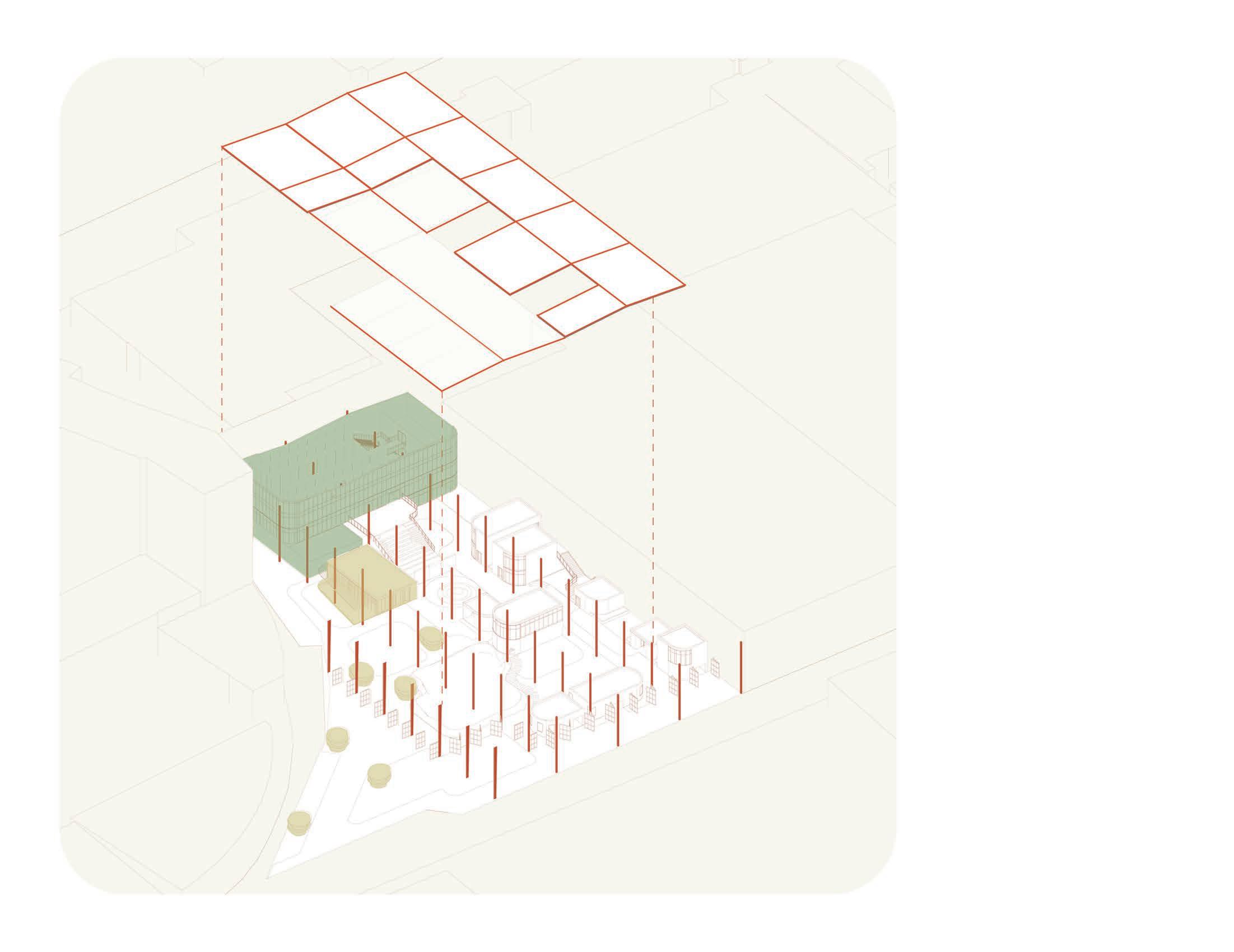 Placed at the front of the site near the open study areas and plaza, it is a visible location for those responsible of child users, who can sit to read or enjoy a snack while their young play and learn.