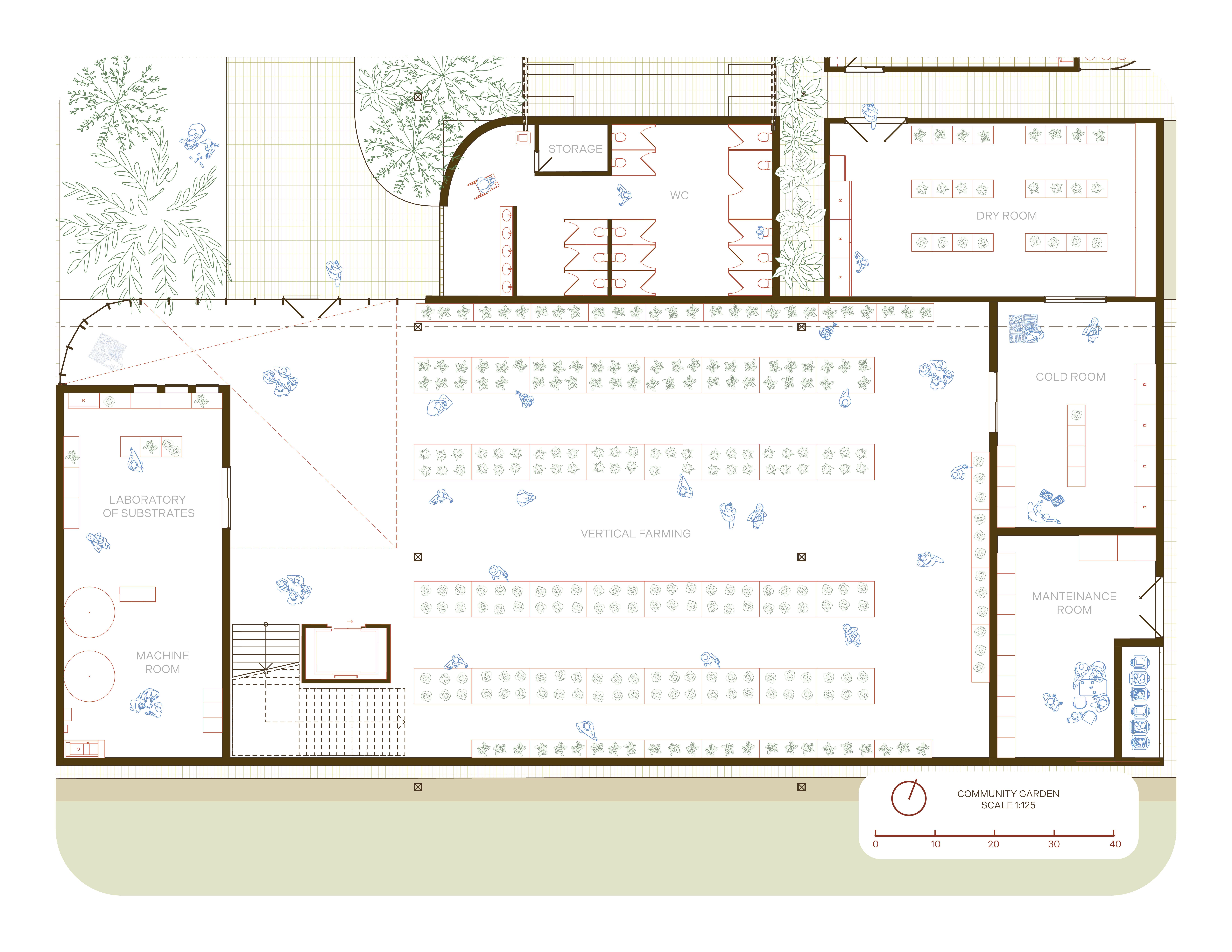 The space, a triple height enclosure with a north-facing curtain wall, procures natural lighting while controlling the crop’s growing conditions artificially. Its water efficiency permits recycling more than half of daily inputs. Nutrient solutions are crafted at the laboratory, irrigation systems powered by a machine room, and crops end up in dry or cold storage before consumption. Excess biomass is composted, and plant transpiration is condensed and used for air conditioning. Tomorrow’s farming wastes nothing.