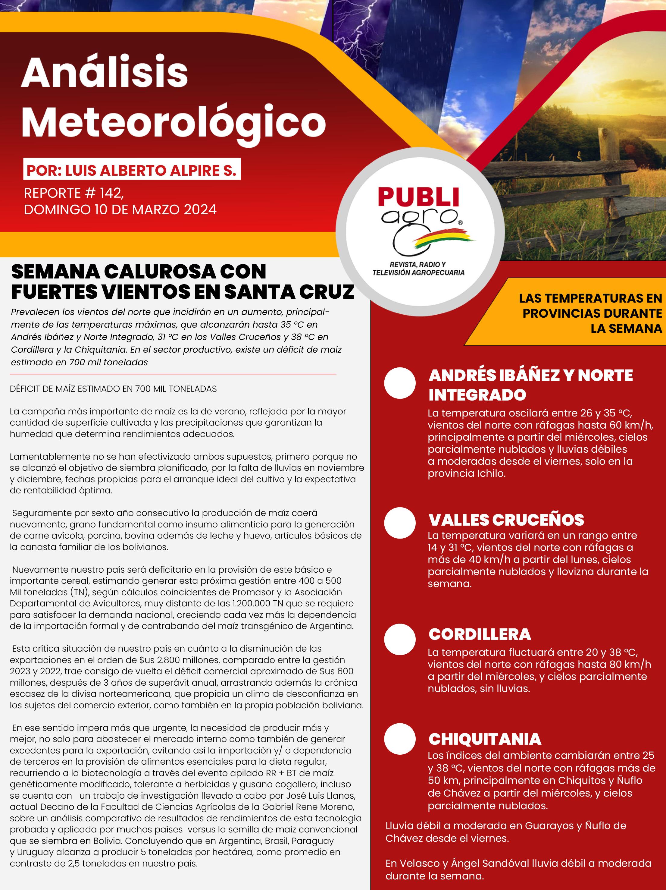 nuestra demanda de maíz, lo que subraya la urgencia de explorar el uso de biotecnología para abordar estos desafíos”, afirmó Cirbián. Los productores tienen puestas sus expectativas en el maíz producido en la zona de la Chiquitanía, especialmente en Concepción. Esperan conocer los volúmenes que se producirán este año para abastecer los diferentes sectores