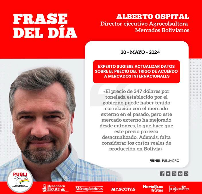 ¨El precio de 347 dólares por tonelada establecido por el gobierno puede haber tenido correlación con el mercado externo en el pasado, pero este mercado externo ha mejorado desde entonces, lo que hace que este precio parezca desactualizado. Además, falta considerar los costos reales de producción en Bolivia ̈, afirmó Ospital. Para los productores de trigo, este precio de estímulo resulta insuficiente debido a los altos costos de producción y los rendimientos nacionales. El experto considera