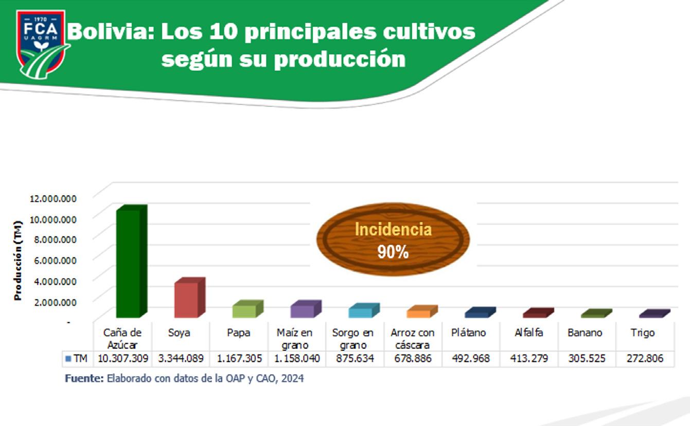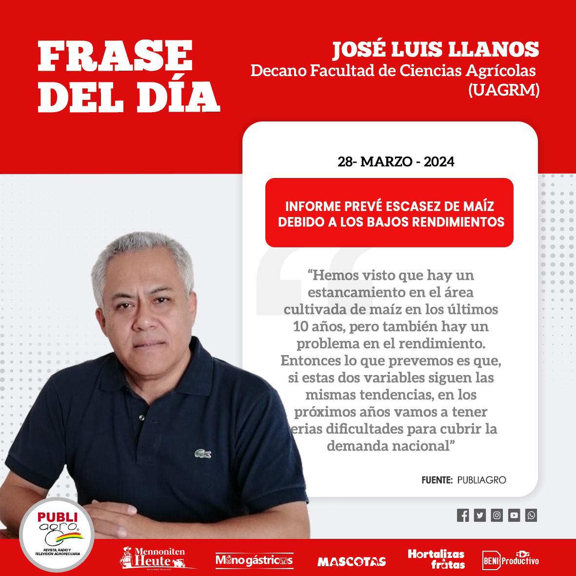 José Luis Llanos, decano de la Facultad de Ciencias Agrícolas (FCA) de la Universidad Autónoma Gabriel René Moreno, presentó un dato preocupante relacionado a la producción de maíz en el Análisis del Sector Agropecuario Boliviano gestión 2022-2023. Se trata de un cultivo estratégico en nuestro país porque está relacionado directamente a la seguridad alimentaria, porque es utilizado en la nutrición de los pollos, cerdos y ganado bovino. Llanos enfatizó que con el trigo hace varios años que hay dificultades para cubrir la demanda nacional, mientras en el caso