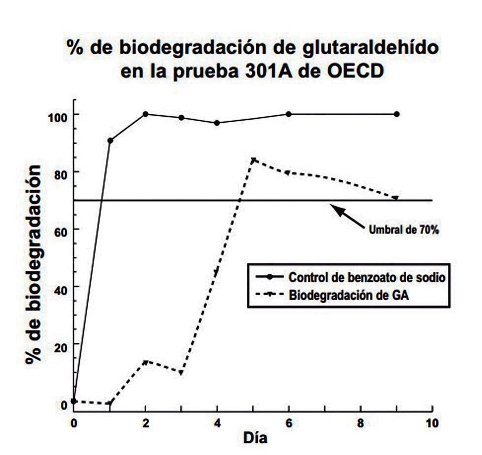 La vía principal para la descomposición del glutaraldehído en los sistemas naturales es a través de la biodegradación. Como demostrado en la Figura 2, el glutaraldehído es considerado "fácilmente biodegradable" por los métodos de ensayo estándar aceptados internacionalmente (OECD 301) y ha demostrado una rápida biodegradación tanto en ambientes aerobios, como anaerobio y también en agua de mar mediante la prueba OECD 306 para la biodegradabilidad inherente.
