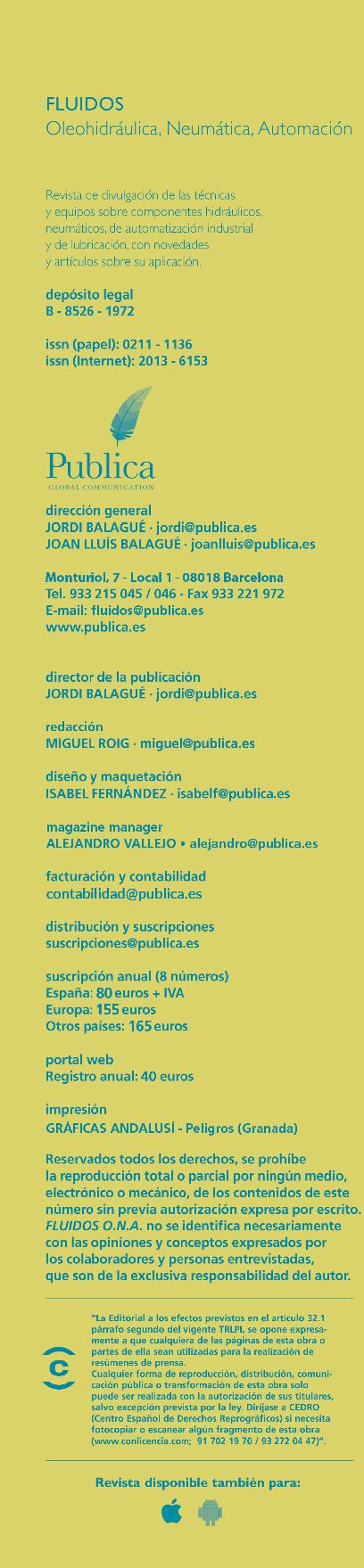 sumario nº 460 ABRIL NÚMERO 460 ABRIL 2023 ISSN 0211-1136 VOLUMEN 52-2023-3 FLUIDOS O.N.A. 460 ABRIL 2023 VOLUMEN 52 2023 3 ISSN 0211 1136 Editada desde 1972 www.fluidosona.com NOVEDADES CATÁLOGOS Y DOCUMENTACIÓN EMPRESAS Rayflex cumple 20 años ENTREVISTA Alicia Richart: “La industria española se encuentra ilusionante con respecto a la digitalización” COMUNICACIÓN INDUSTRIAL Sin duda, es el momento para la comunicación wireless NOTICIAS GUÍA DEL COMPRADOR 144 EMPRESAS Rayflex cumple 20 años 148 NOVEDADES 158 CATÁLOGOS Y DOCUMENTACIÓN 160 COMUNICACIÓN INDUSTRIAL Sin duda, es momento para la comunicación wireless Alejandro Molinero 162 VACUUM PUMPS Energy-efficient and sustainable vacuum solutions from Atlas Copco at Noelle+von Campe 164 ENTREVISTA Alicia Richart: “La industria española se encuentra en un momento ilusionante con respecto a la digitalización” 166 EMPRESAS CMZ y NSK; colaboración tecnológica al más alto nivel durante más de 25 años 168 VALVES Towards a CO2-neutral factory 172 VALVES MARKET Weak construction sector slows down building valves industry 174 NOTICIAS 187 GUÍA DEL COMPRADOR
