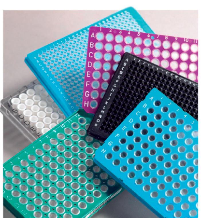 Placas de PCR coloreadas de 96 pocillos con faldón