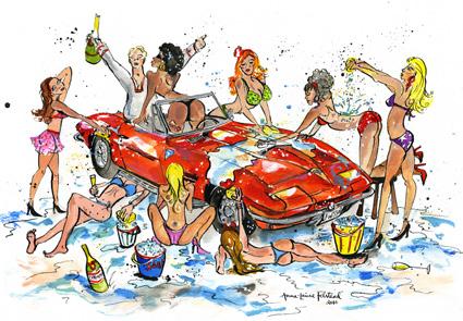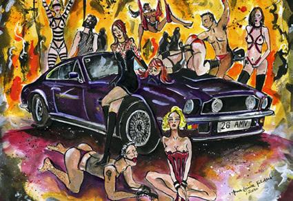 As her reputation as a talented painter of cars grew, one interesting side-line – which she calls her ‘naughty car paintings’ – emerged. A-L takes up the story. “I was at Pebble Beach in 2010 and an Aston Martin dealer approached me and asked me to paint his car. He sent me a picture of it but asked if I could paint his girlfriend in the picture too.