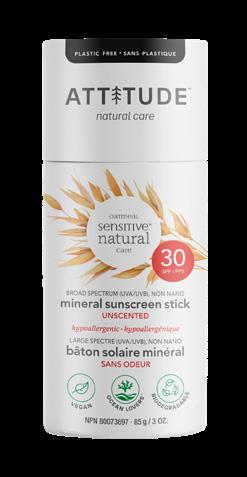 Les écrans solaires ATTITUDE sont formulés avec des molécules d’oxyde de zinc sans nanoparticules. La taille des particules protège la peau des rayons UVA et UVB et permet une application facile sans laisser de trace blanche. Les tubes en carton biodégradable novateurs d’ATTITUDE offrent un applicateur à poussoir. Ce format est pratique, ne fond pas et est idéal pour les déplacements. Puisqu’ils sont solides et ne contiennent pas d’eau, ils sont permis dans les bagages à main!