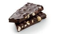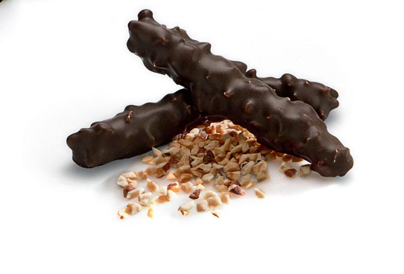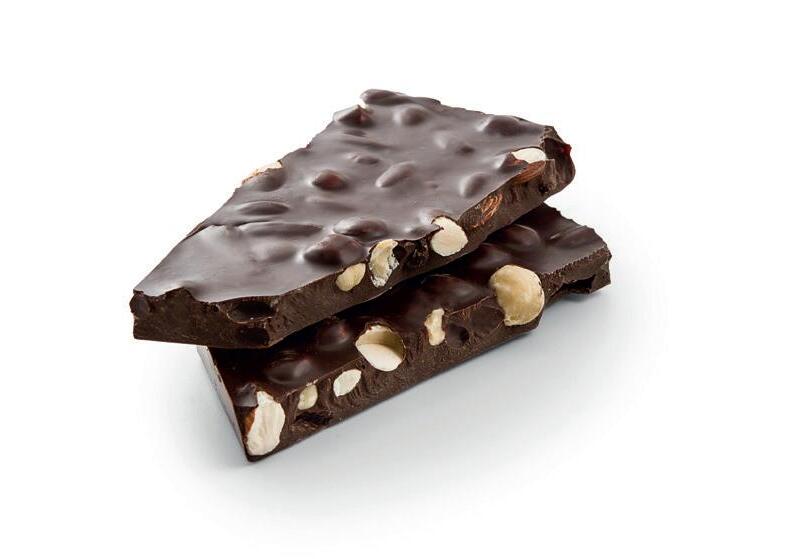 • Chocolat noir 63% de cacao décoré d’amandes et noisettes caraméllisées, pistaches, bâtonnets d’orange confite, billes rouge