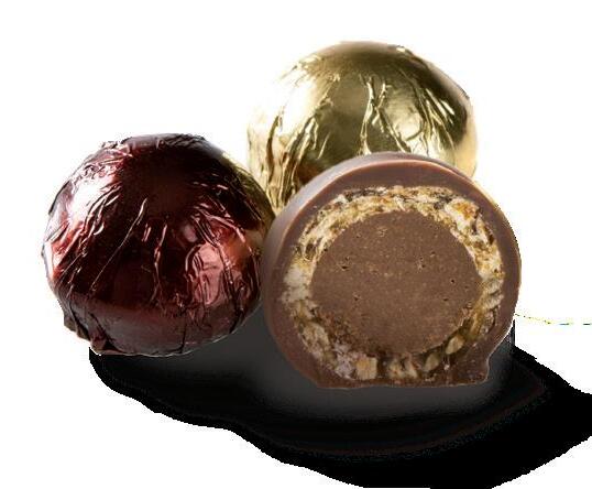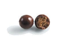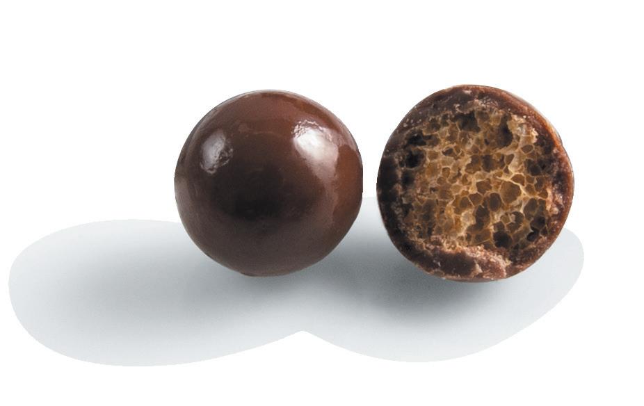 • BOLA DE CEREAL INFLADO CON LECHE, ligera y crujiente, recubierta de chocolate con leche.