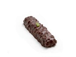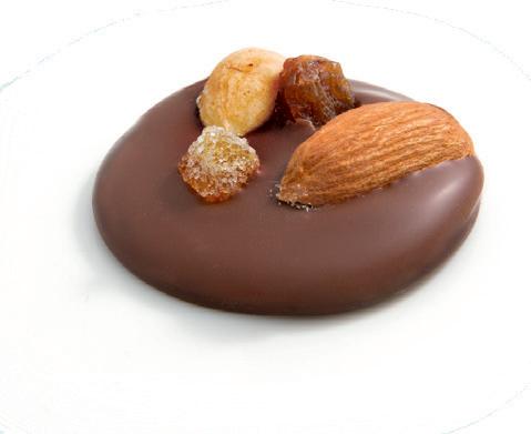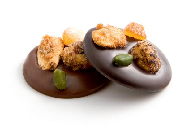 • Chocolate negro 63% cacao decorado con almendras y avellanas caramelizadas, pistachos, bastoncillos de naranja confitada, bolitas y bolitas rojas