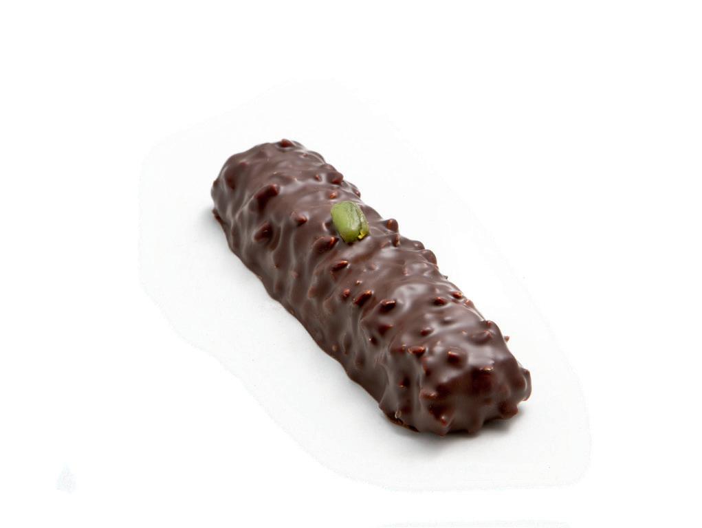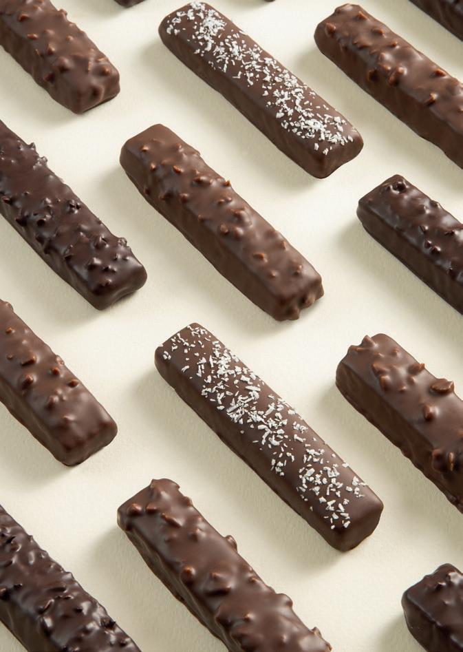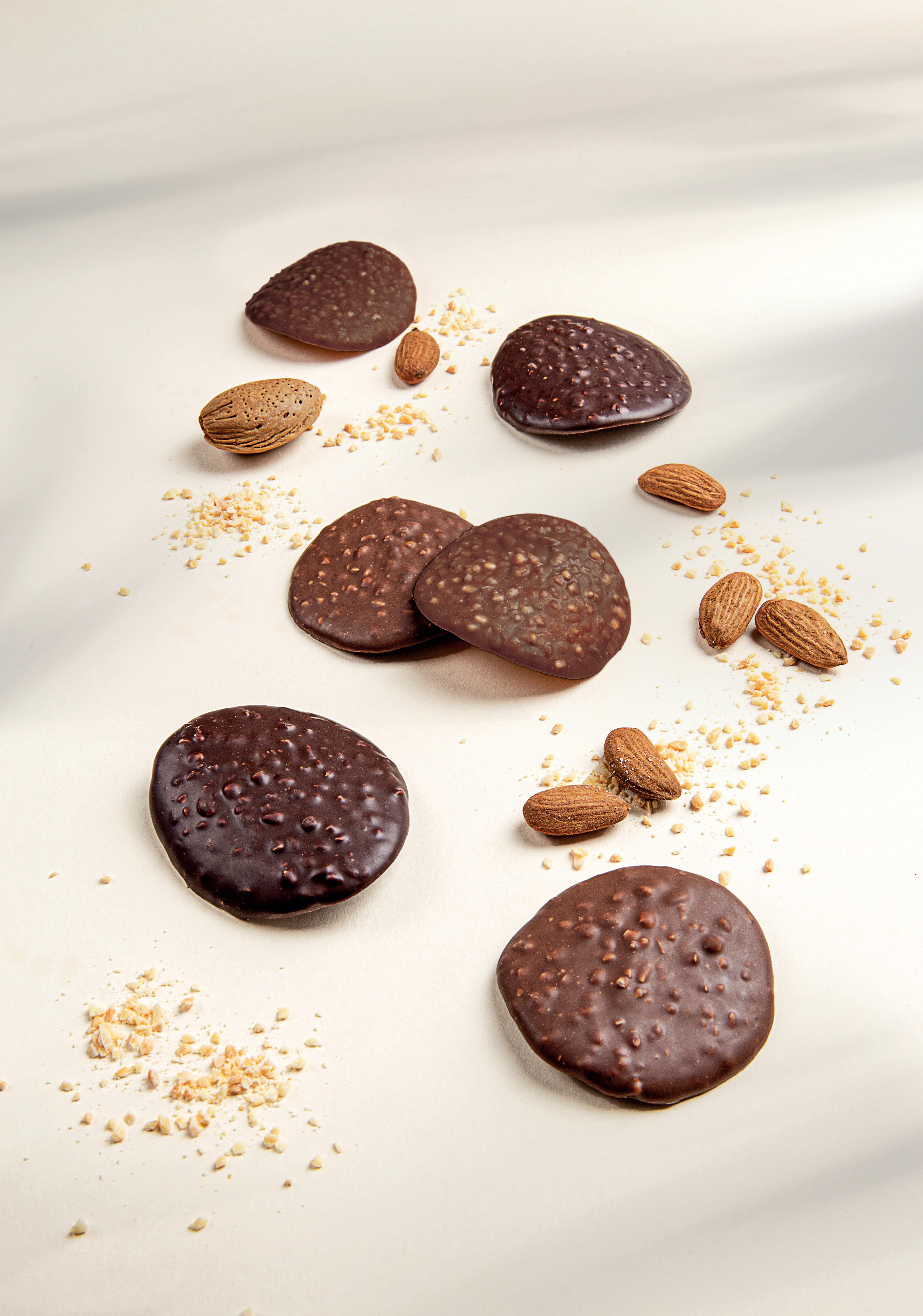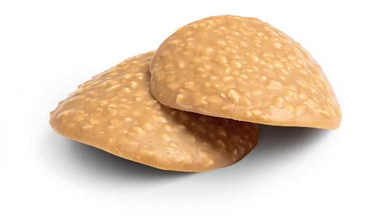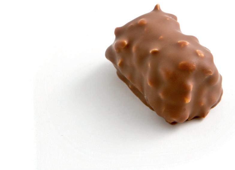 • la BARRE PRALINÉ LAIT, où praliné biscuité, éclats de caramel et fleur de sel offrent une expérience croquante et gourmande.