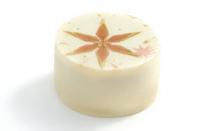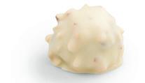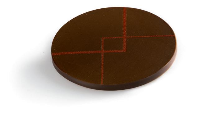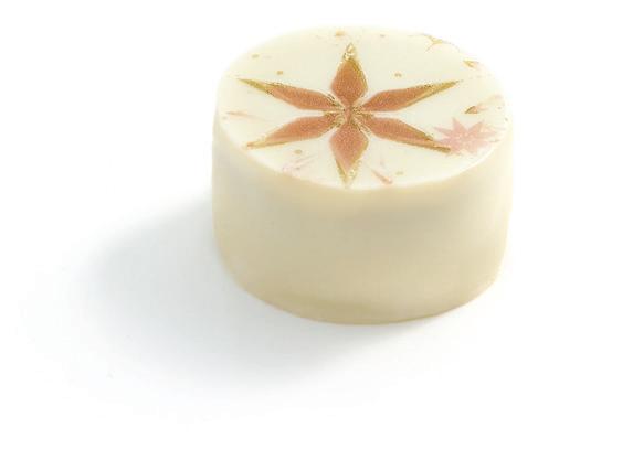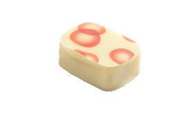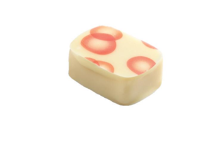 • Chocolat ivoire, décoré de chocolat noir, d’écorces d’orange confites de billes rouges et de mini billes