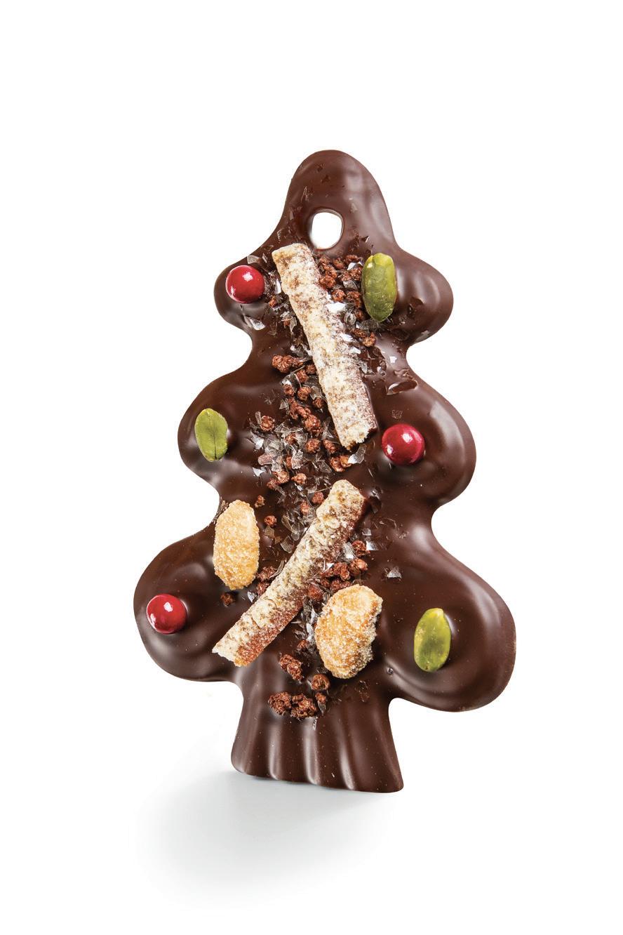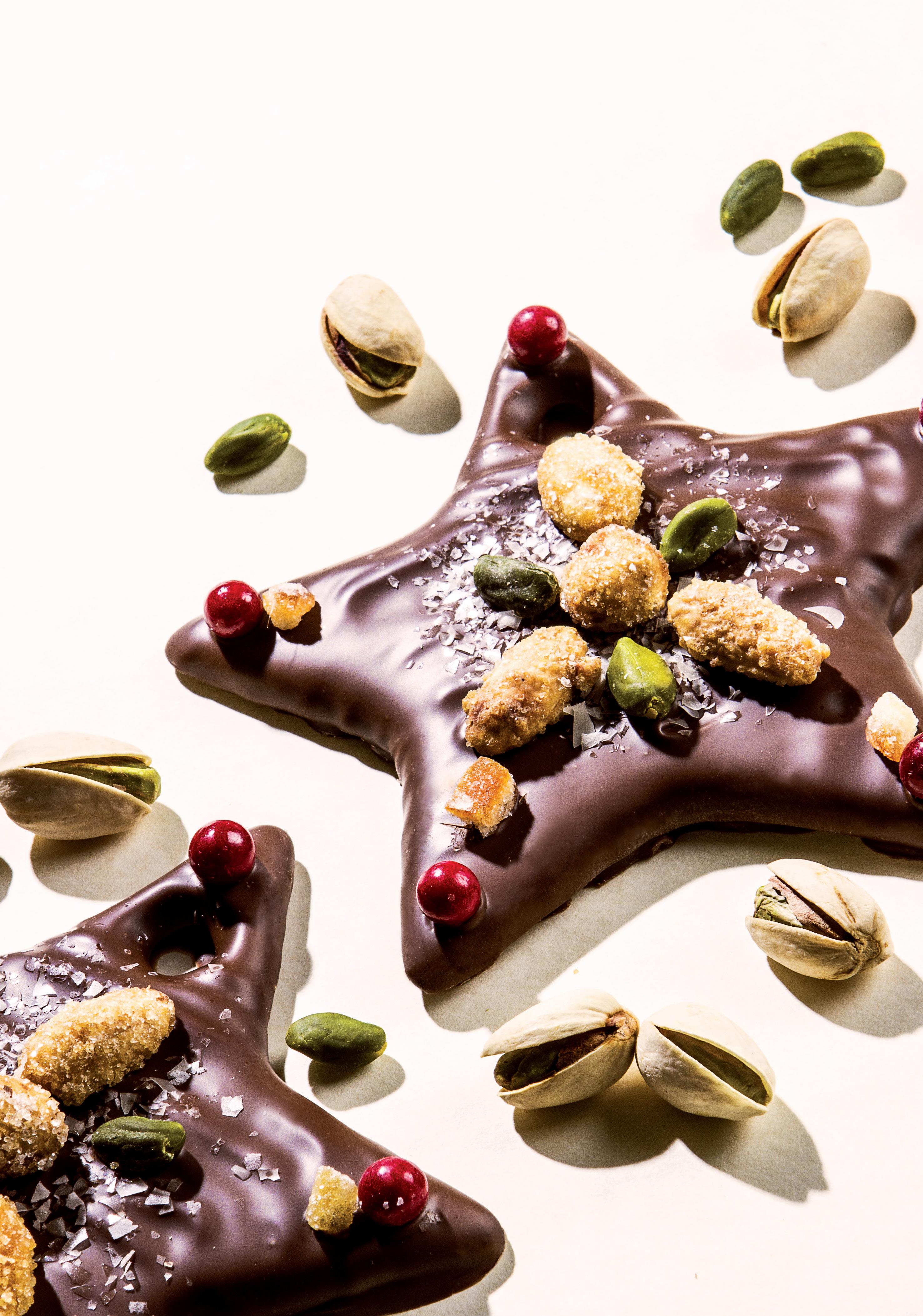• Estrella de chocolate con leche 39% cacao decorada con almendras y avellanas caramelizadas, pistachos, dados de naranja confitados y bolitas rojas