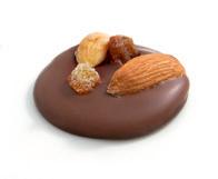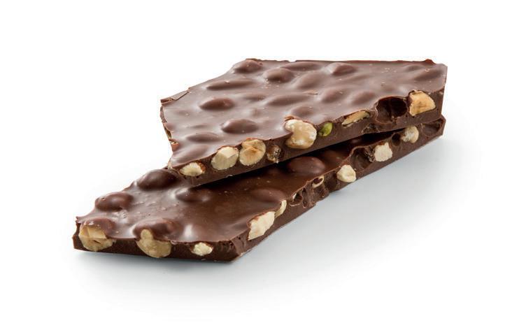• Chocolat lait 39 % de cacao décoré d’amandes et noisettes caramélisées, de pistaches, de dés d’orange confite et billes rouges