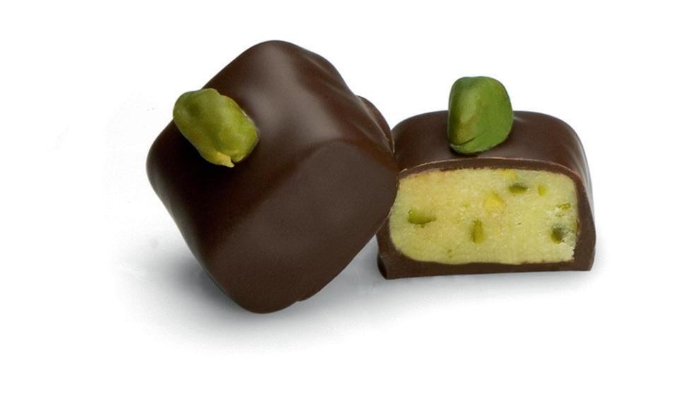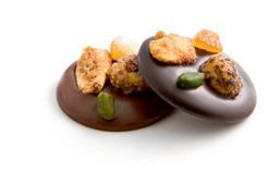 • Plain dark chocolate 63% decorated with caramelized almonds and hazelnuts, pistachios, candied orange sticks and red marbles