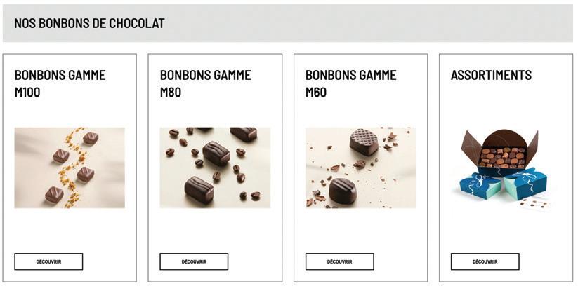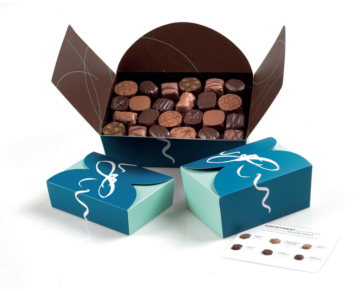 Todos nuestros bombones de chocolate están envasados y protegidos en cajas de 0,9 kg a 3,5 kg. En el caso de chocolates con envases específicos, se menciona al lado de la descripción de cada producto (por ejemplo: chardons, bouchées…).