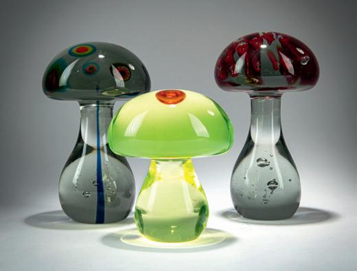 H. 12 - 17,5 cm. Ausführung: Gino Cenedese. Überfangglas, farblos mit Unterfängen, Fleckeneinschmelzungen und Murrinen in diversen Farben. Ein Pilz mit Herstelleretikett.