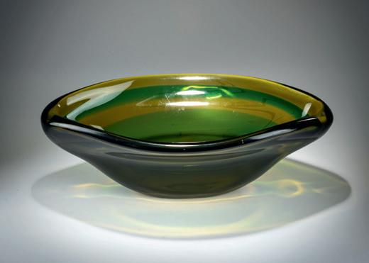 H. 17 cm; L. 47 cm. Ausführung: Salviati & C. Überfangglas, farblos und moosgrün mit flaschengrünen Bändern.