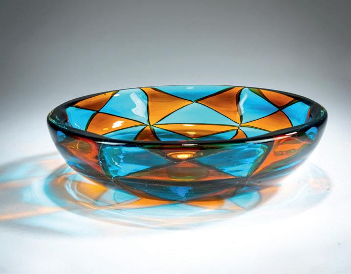 Ø 22,5 cm. Ausführung: Barovier & Toso. Überfangglas farblos mit eingeschmolzenen Plättchen in Violett, Lattimo und Grün.