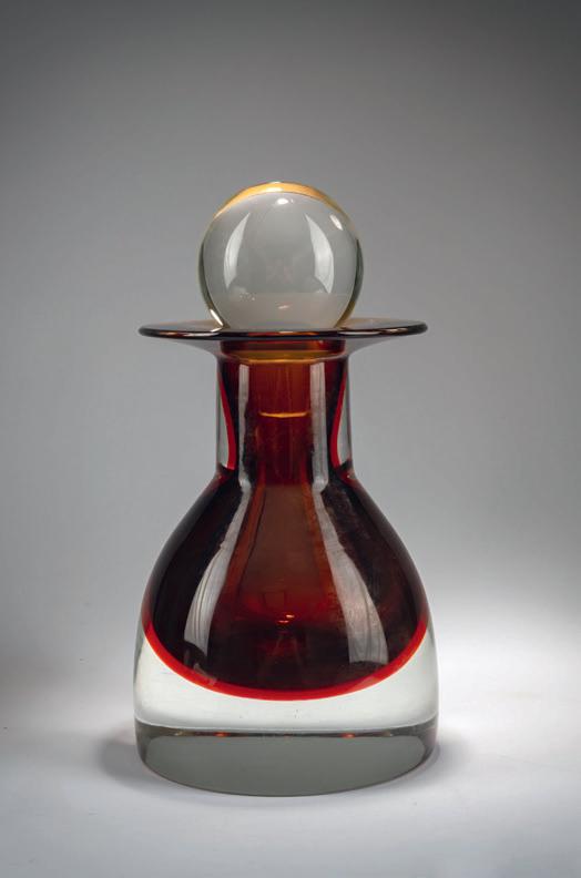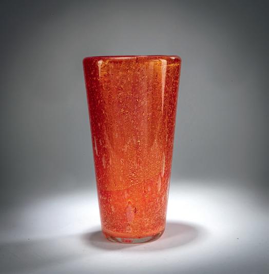 H. 30 cm. Ausführung: V.A.M.S.A. Überfangglas, farblos und rot mit Goldfolie.