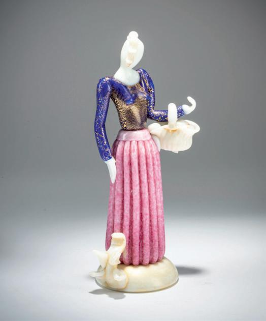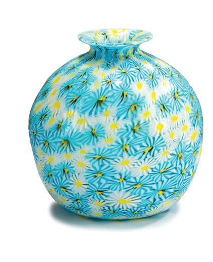H. 25 cm. Ausführung: Barovier & C. Weiße und blaue Glasmassen, partiell mit rosa Kröselaufschmelzungen, teils mit Goldfolie.