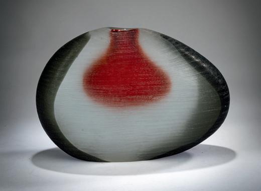 H. 16,5 cm. Ausführung: Alfredo Barbini. Farbloser Glasblock mit rotem und partiell grauem Unterfang, Oberfläche mit feinem Kerbschliff. Am Boden bez.: Alfredo Barbini (graviert).