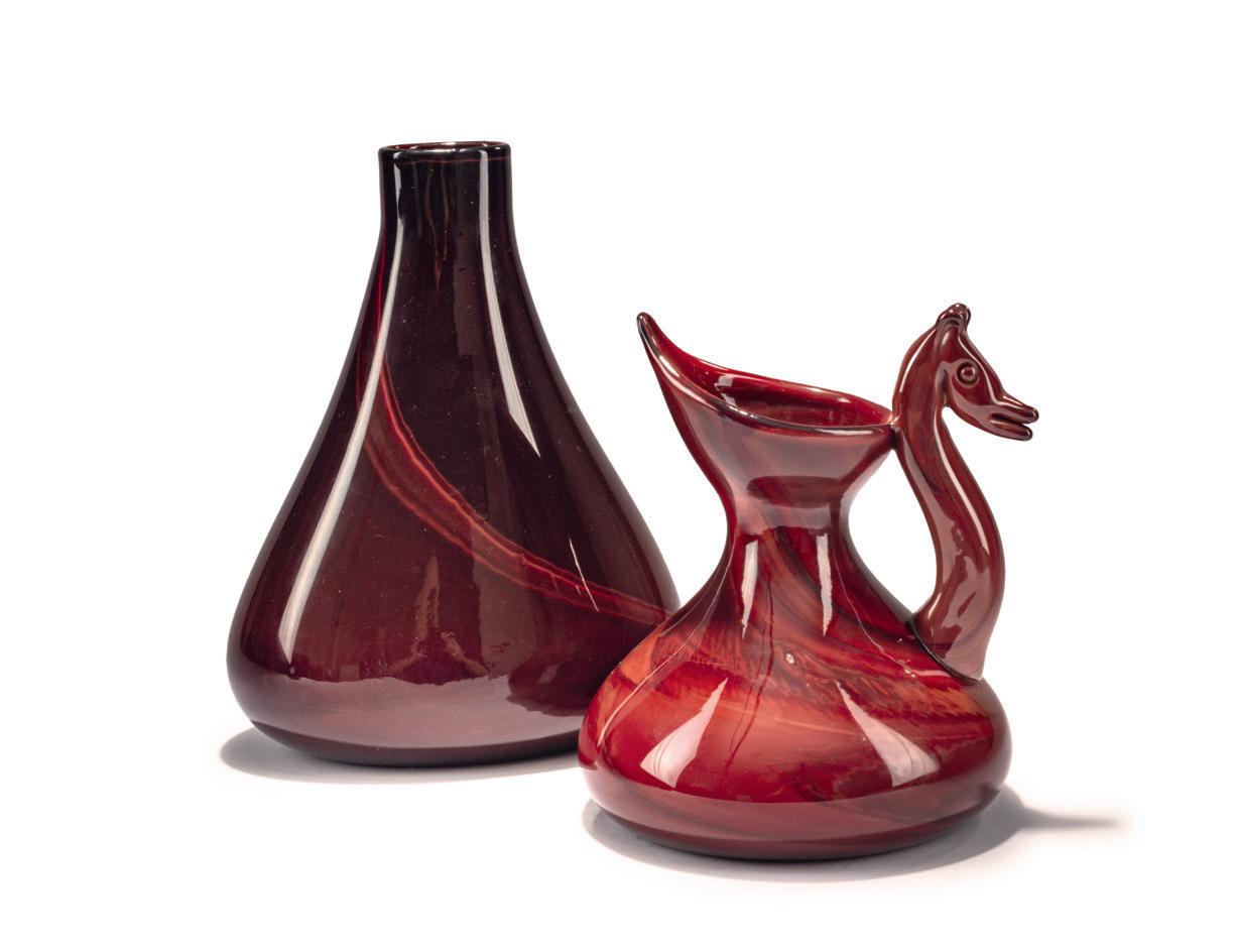 Krug mit Seepferdchen-Henkel. H. 16 cm. Glas, farblos und siegelrot marmoriert. Am Boden bez.: Papier-Klebeetikett des Herstellers mit Nummerierung: 22706. Vase auf ovalem Stand. H. 21 cm. Überfangglas ziegelrot marmoriert. Ausführung:
