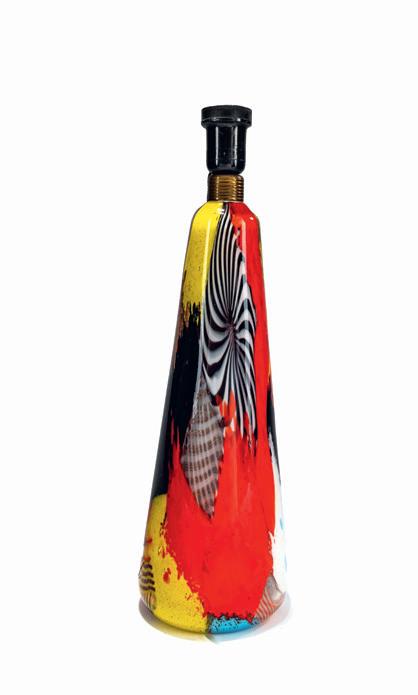 Abgeflachter Korpus mit langem Hals. H. 70 cm. Ausführung: Gino Cenedese. Überfangglas, farblos, rot, gelb, grüngelb, türkis und rauchgrau.