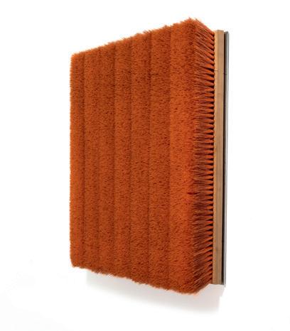 7 orange brooms on aluminum plate. 54.0 x 56.0 x 9.5 cm. Signed on the reverse: O. Hörl and dated: (19)95 (black felt-tip pen).