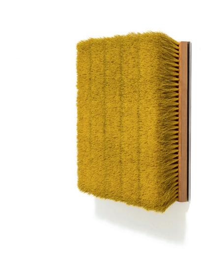 5 yellow brooms on aluminum plate. 39.0 x 39.5 x 9.5 cm. Signed on the reverse: O. Hörl, dated: (19)93 (black felt-tip pen), and typographically inscribed on an adhesive label: GELB 100-35.