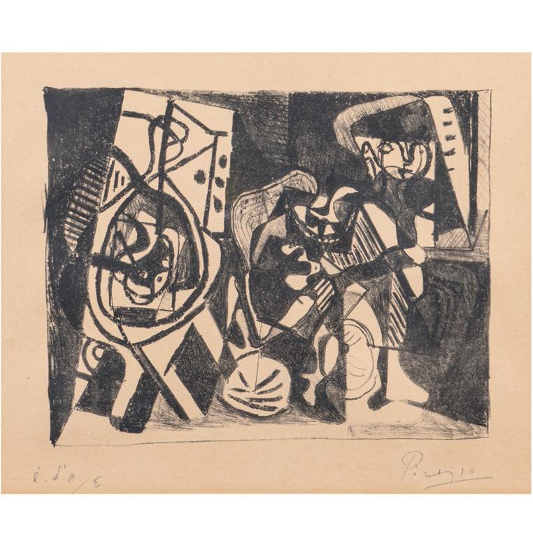 Lithograph on Arches wove paper (with trimmed watermark). 22.5 x 28.2 cm (print), 52.0 x 63.0 cm (frame). Inscribed lower left: é. d'a./II (for épreuve d'artiste), signed lower right: Picasso, signed again on the reverse: Picasso, dated: 24.1.(19)61 (pencil), and annotated from an unknown hand. EA-copy alongside an edition of 100, published by Galerie Simon, Paris; printed by Charlot Frères, Paris. Framed under glass in a passe-partout.