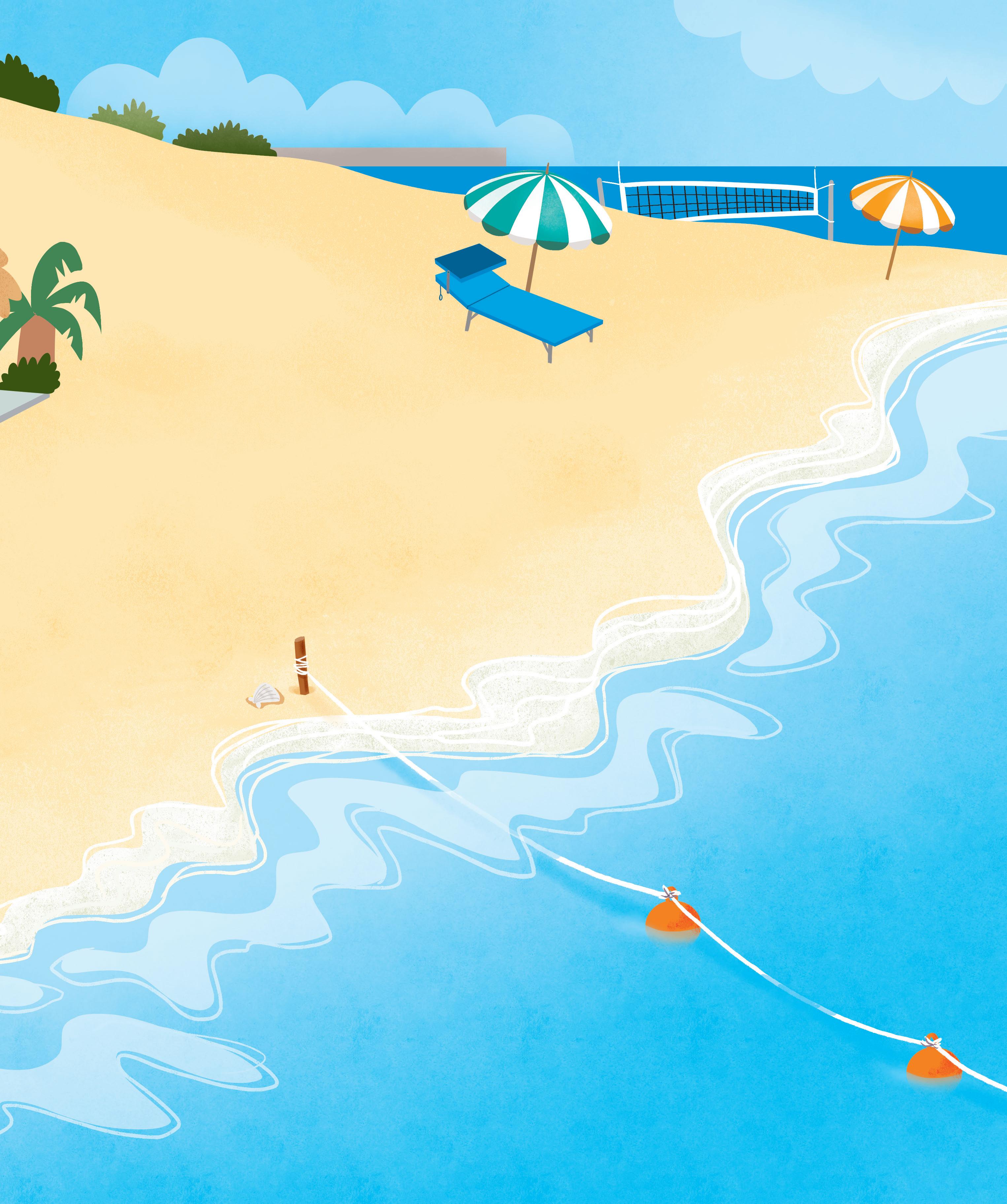 La spiaggia è sinonimo di vacanze! Prendi la tintarella e divertiti a fare un giro in pedalò, a creare meravigliosi castelli di sabbia, oppure a giocare a palla mentre fai il bagno con gli amici! E ricordati: tieni puliti il mare e la spiaggia, perché sono anche la casa naturale di molti animali.