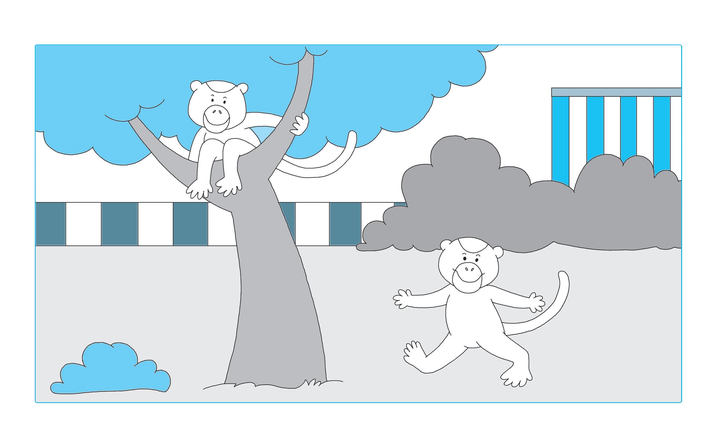 COLORA DI MARRONE LA SCIMMIA SOPRA L’ALBERO E DI ROSSO LA SCIMMIA SOTTO L’ALBERO.