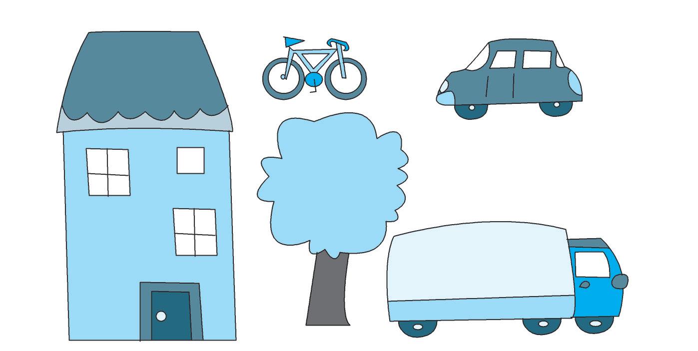 OSSERVA IL DISEGNO ATTENTAMENTE. QUANTI OGGETTI DI OGNI TIPO CI SONO? COLORA UN MATTONCINO PER OGNI OGGETTO.