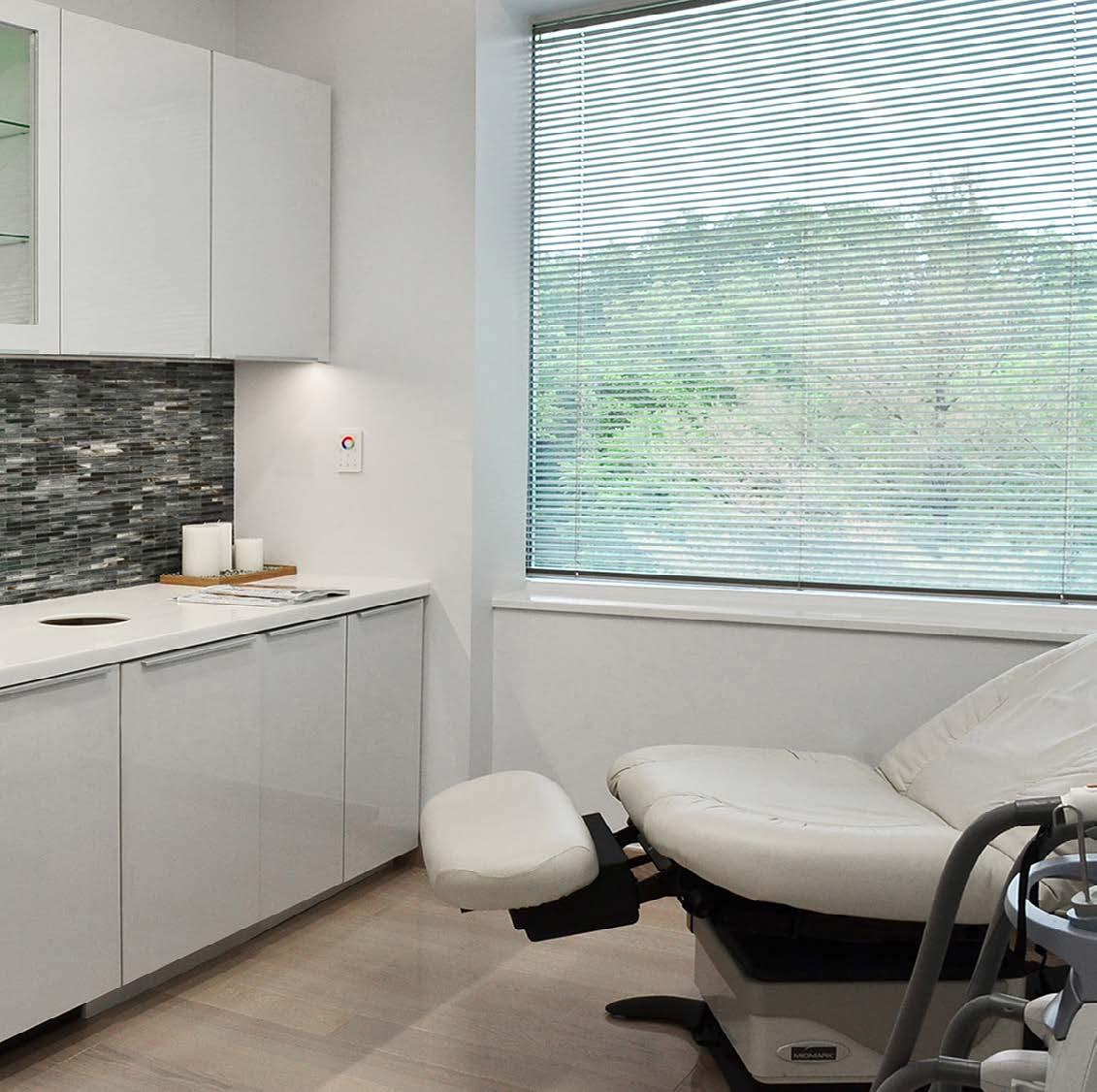 A crisp, hospitality-influenced aesthetic was created by breaking away from the traditionally furnished waiting room to a contemporary ensemble of built-in seating elements and edge-lit partitions. Ceiling lights were carefully positioned to reflect in the polished oversized floor tile, creating a feeling of space and height.