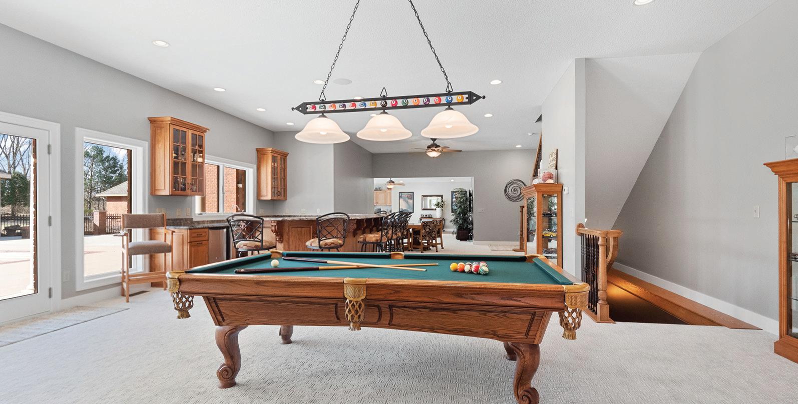 Entertainment abounds throughout the home. Enjoy movie nights in the theater area, complete with a snack station and wet bar, or unwind by the brick fireplace in the hearth room. The exceptional recreation area is perfect for billiards and darts and includes a second full kitchen, a full bar, and a full bath.