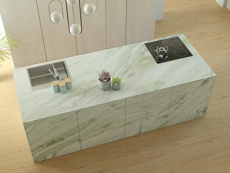 SEQUOIA GREEN. Il marmo, materiale naturale particolarmente igienico e facile da pulire, acquisisce valore e personalità con il passare del tempo rendendo gli spazi unici e personalizzati. Nell’immagine, il marmo dal fondo bianco tendente al verde delicato che si caratterizza per le marcate venature di verde più scuro.