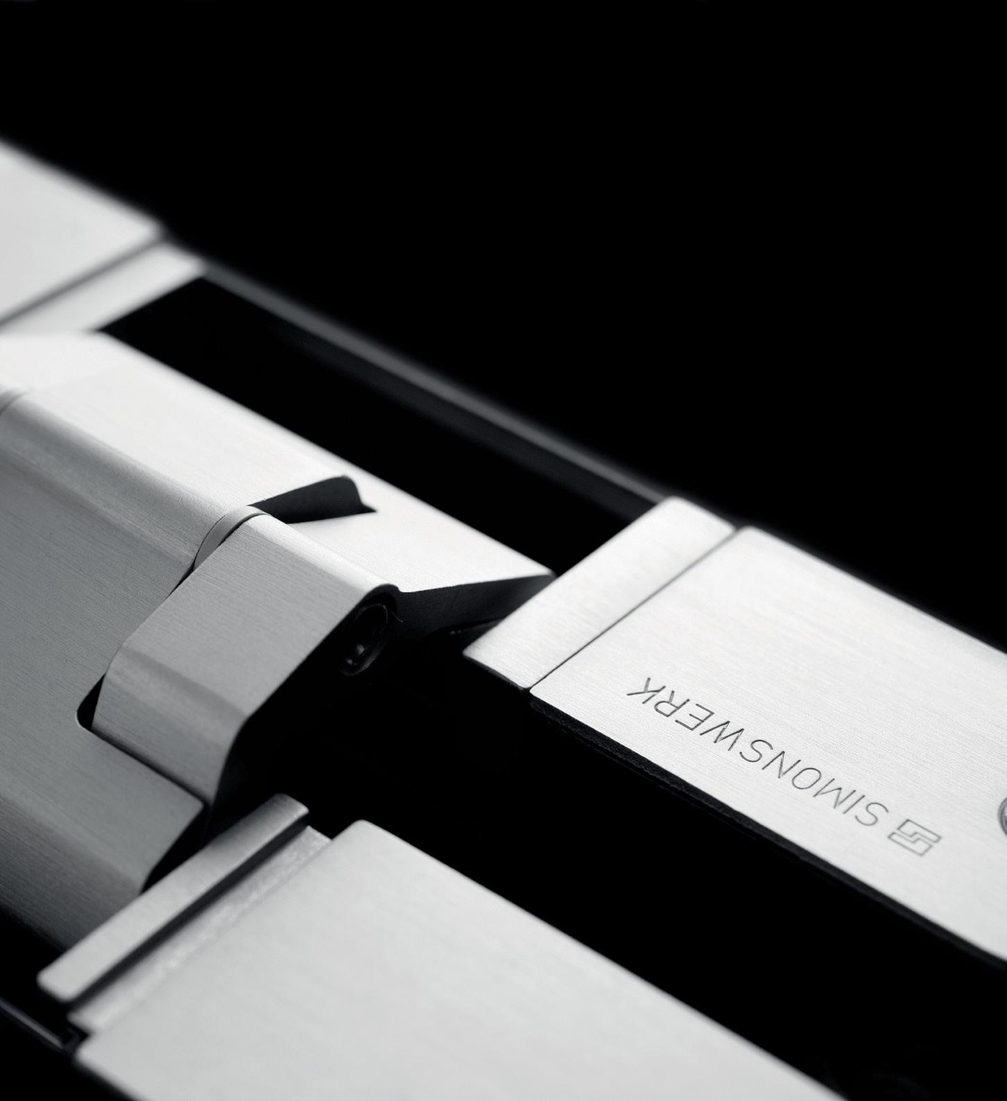 L’apertura con gole taglia la superficie delle basi mettendo in evidenza la ricerca della massima dematerializzazione e facendo percepire la sottigliezza dell’anta di solo due millimetri di spessore. Design di Gabriele Centazzo.
