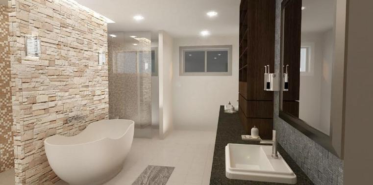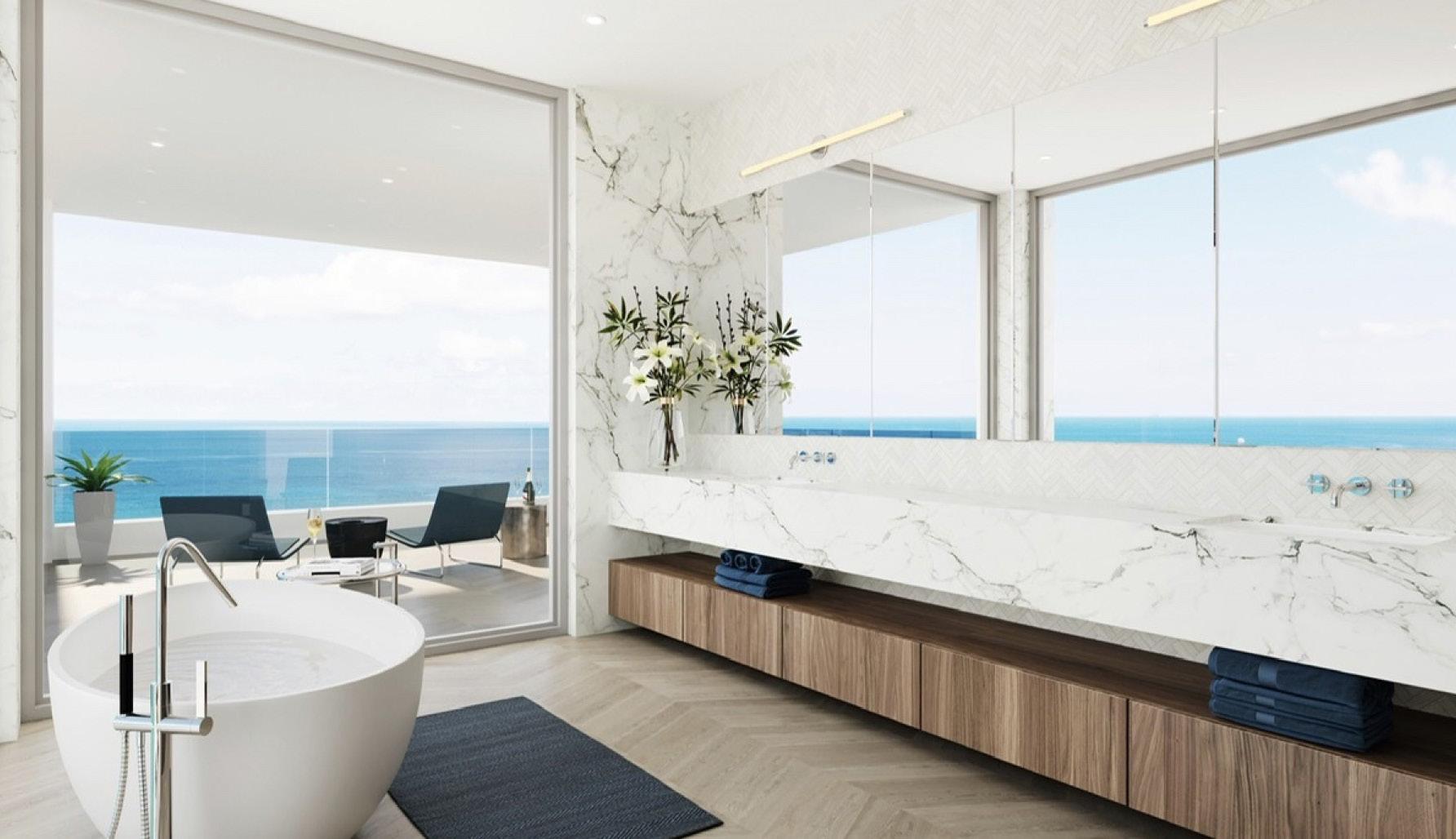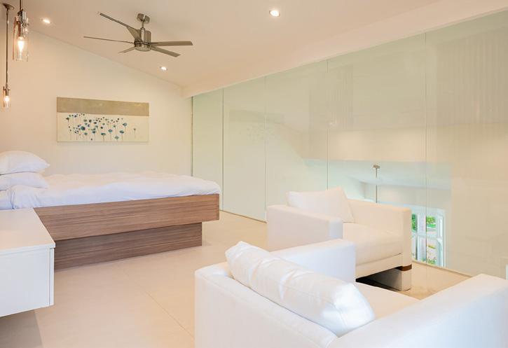 • Master bathroom has sea view, floor-toceiling windows with switch-activated opaque film to ensure privacy
