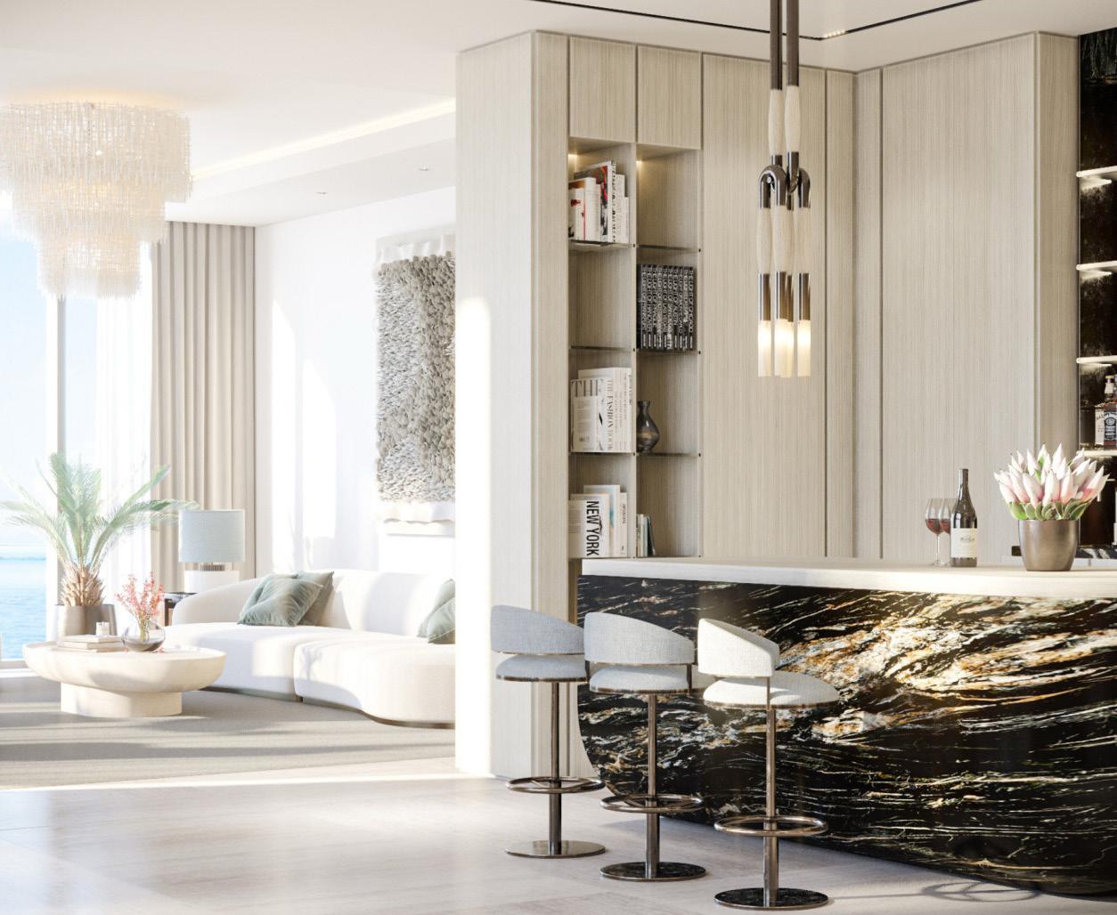 Property amenities and 5 Star services include expansive full-service Seafront lounge with owner’s oenotheque, refined library lounge, on-property chefs, private dining rooms, expansive boardroom, private cinema, state-ofthe-art fitness studio, exclusive private trainer, guest suites, valet, and property vehicles with chauffeured service. Owners enjoy onsite access and founding memberships to a 16,000 square foot luxury spa and future fine dining restaurant.