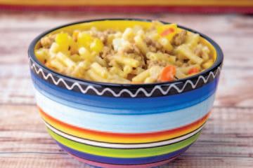 To make this Taco Mac and Cheese, simply prepare your favorite boxed mac and cheese according to the package instructions and stir fry the meat and vegetables together. (Hint: You can even chop vegetables the night before to make cooking the next day even easier.) Then add taco seasoning and combine for a new take on a classic dish.