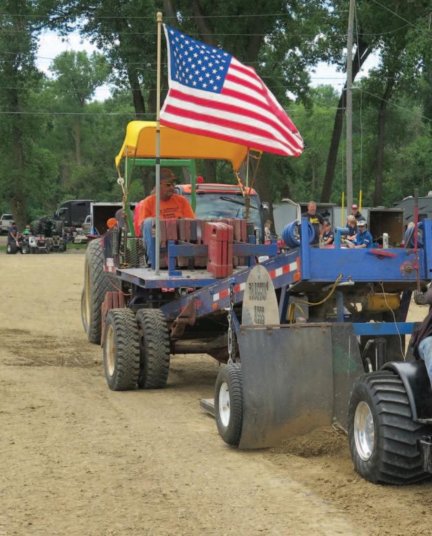 As Becky says, garden tractor pullers, sporting flameretardant suits and helmets, have tunnel vision making their way down the track. “It’s an adrenalin rush,” she explained. “You see only the track and the flag guy at the end.”