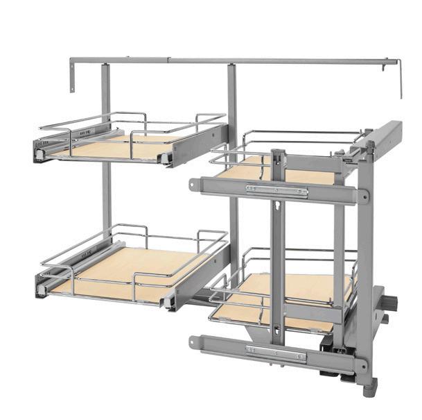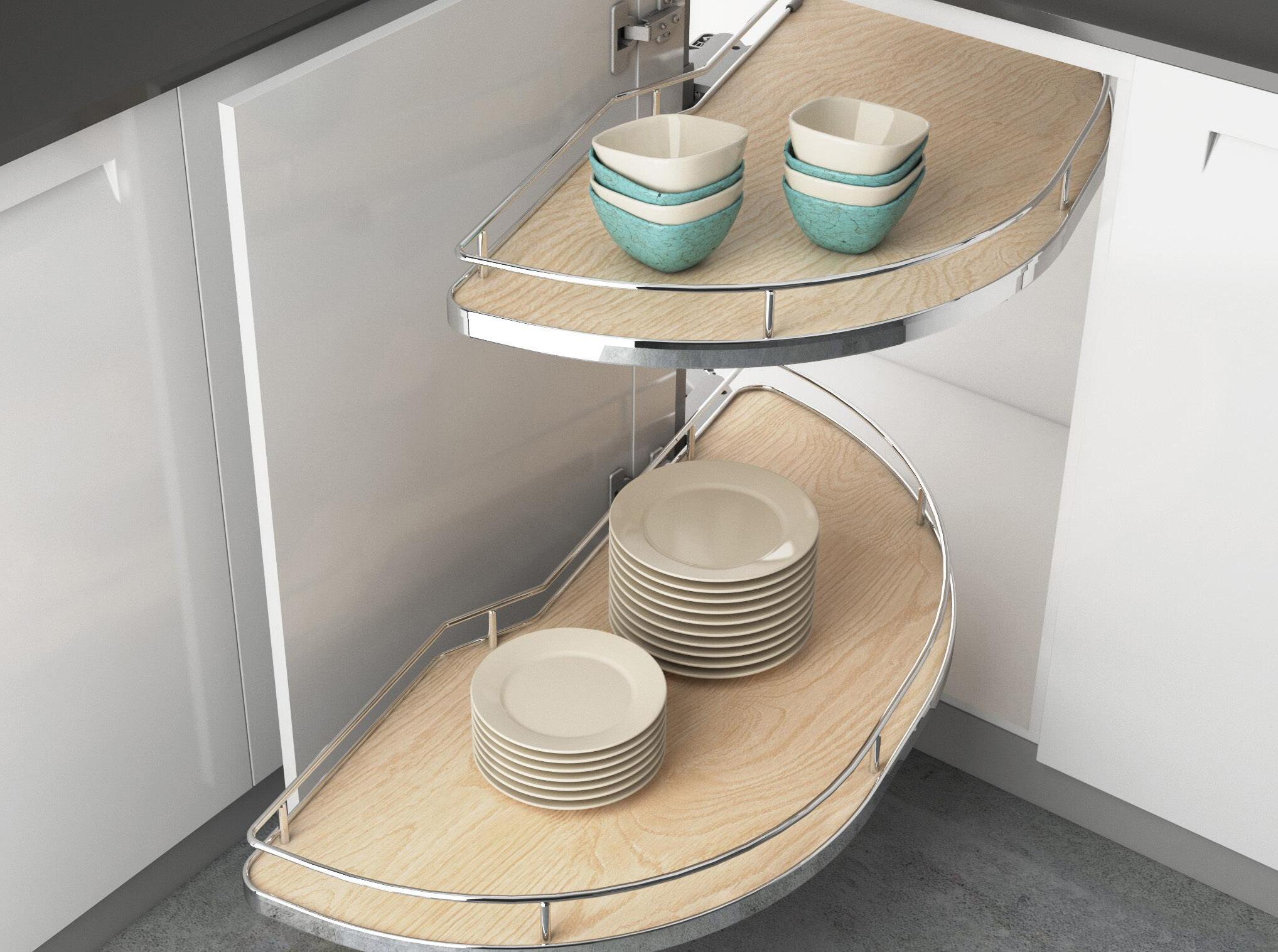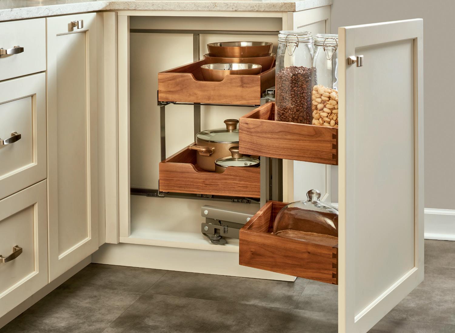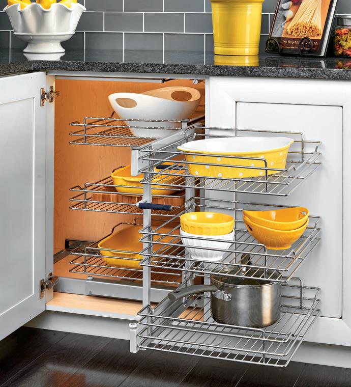 Let Rev-A-Shelf end your blind corner dilemma with our line of innovative organizational accessories. Specially designed to maximize the storage capacity of your cabinets, each product incorporates revolutionary pivot, pull and slide technologies that allow access to every inch of the organizers. While functional and practical, our blind corner solutions are aesthetically pleasing and available in an array of finishes and colors.