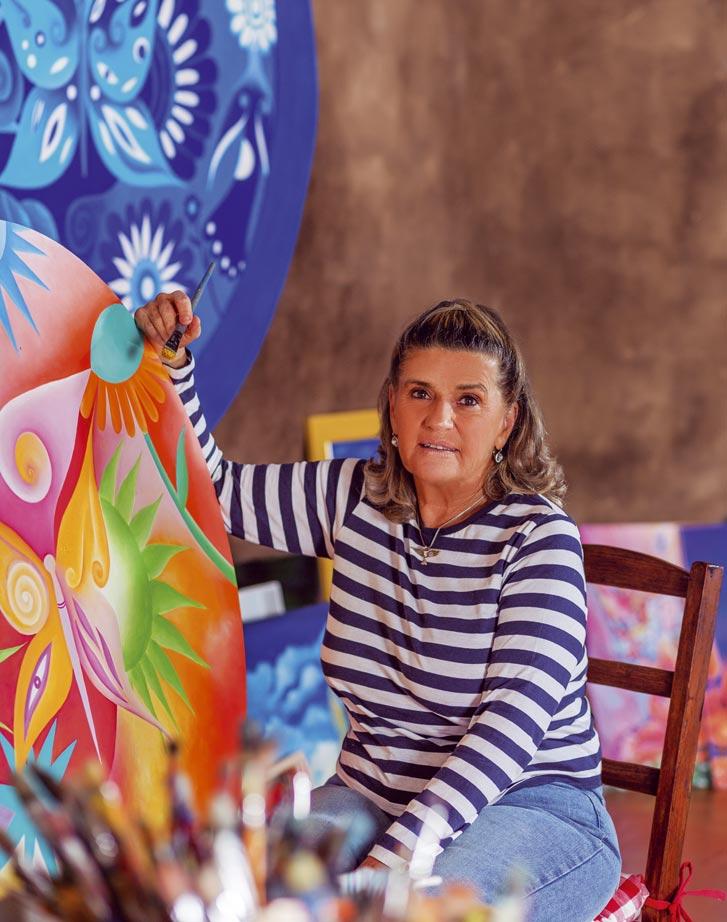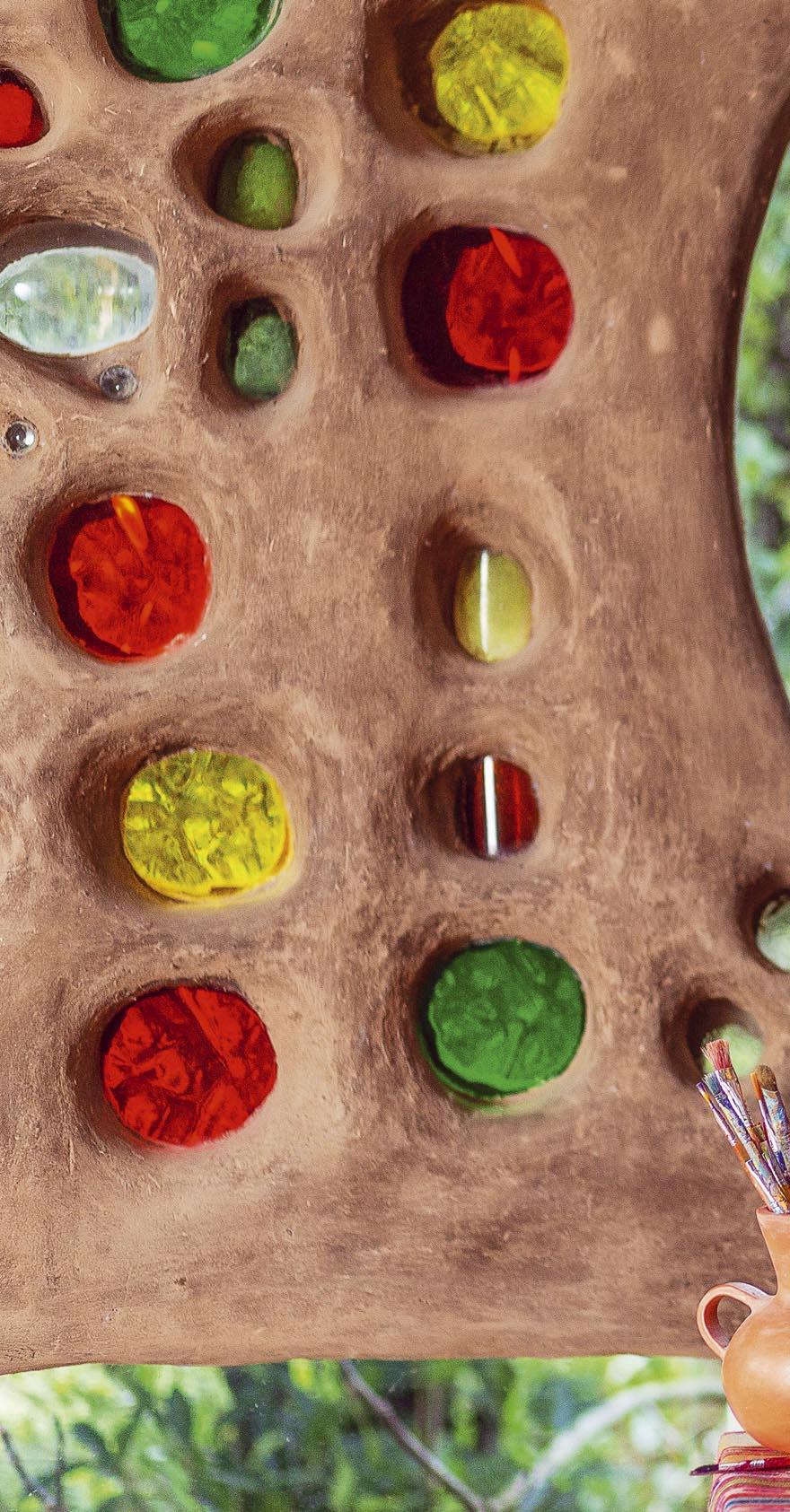 Yo me di cuenta que la forma en que él construyó la casa era respetando la naturaleza, a las plantas, a las flores y los nidos, es decir si había un nido él lo dejaba y envolvía la pared a su alrededor, de esa forma se fue haciendo esta escultura y pudimos vivir dentro de ella. Mi casa no era una casa como todas que tienen living, sofá, heladera, comedor, mi casa era un enorme atelier y yo creo que eso fue lo que me llevó a disfrutar tanto del arte y de la pintura, y a darme cuenta que yo quería ser pintora. Recuerdo que esa mesa gigante de colores y pinceles me invitaban a trabajar y a crear, las tijeras a recortar; esa mesa gigante era para escribir, para pintar, para comer, para charlar y encontrarnos con los amigos. Así que viví siempre en un enorme atelier donde los colores estaban al alcance de la mano, y todas las personas que llegaban si querían pintar o dibujar, se les ofrecía los materiales.