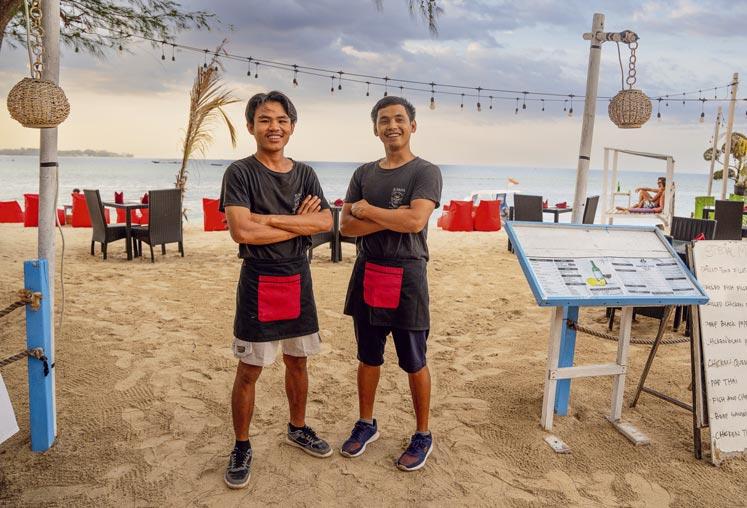 Sholikin y Saraswati, jóvenes que atienden un bar de playa en Gili Air